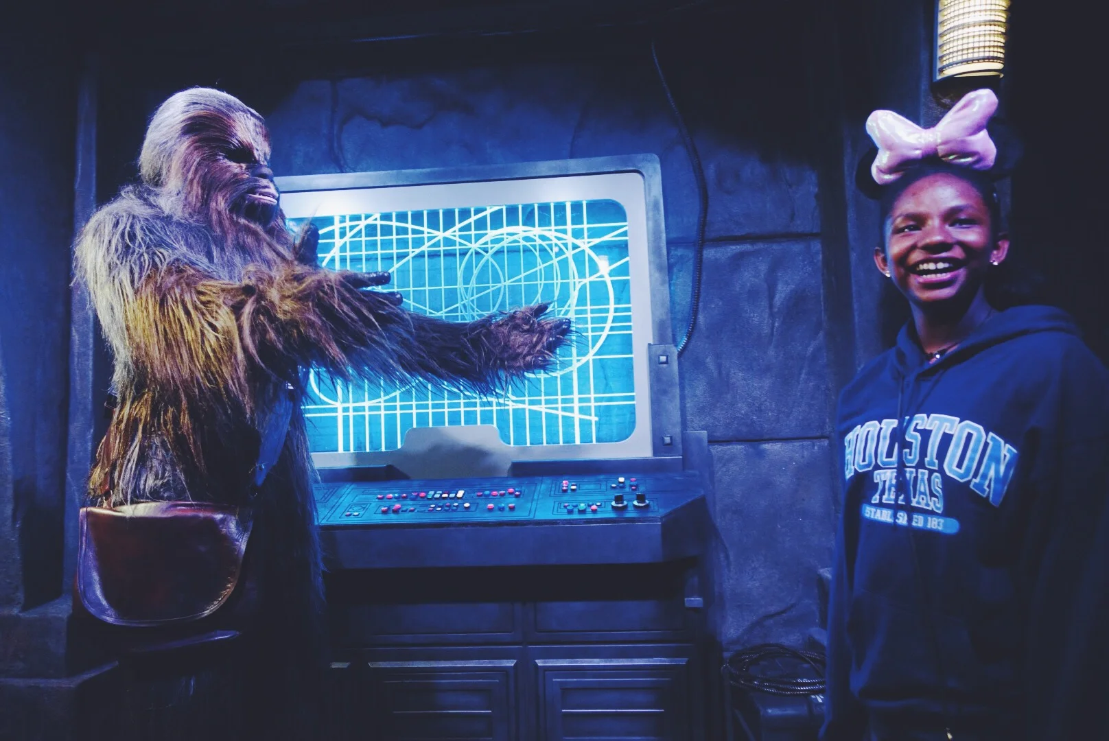 Our first full day at Disney World featured visiting Tibet, a few roller coaster rides, and meeting a Wookiee. We loved it all, but I think you can probably guess which part warmed the cockles of Alex's heart the most.