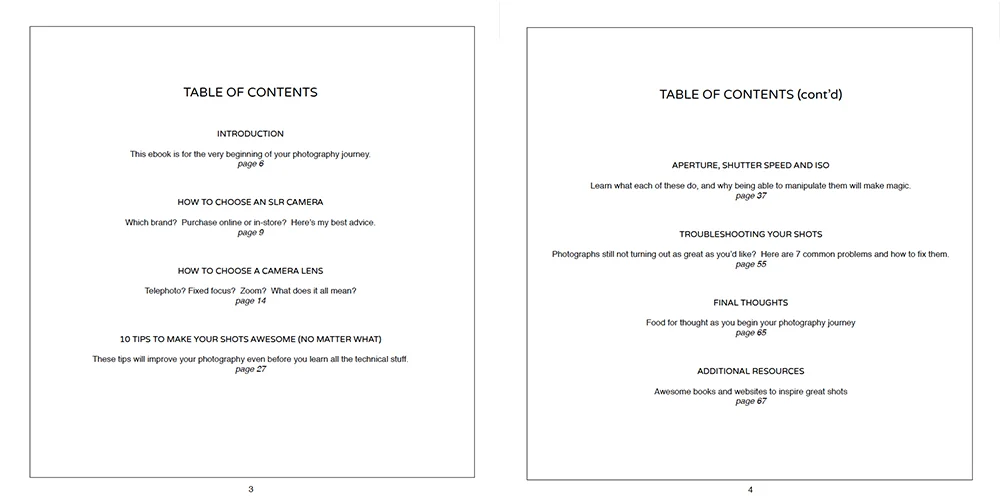 This ebook begins with "how to choose a camera" and "how to choose a lens," and suggests ways to improve your shots while keeping your camera completely in automatic mode, before even venturing into more difficult concepts like aperture, shutter speed and ISO. And once you've played with your camera for a bit, there's even a section that shares common beginner mistakes, and how to fix them. In fact, here's the entire table of contents: