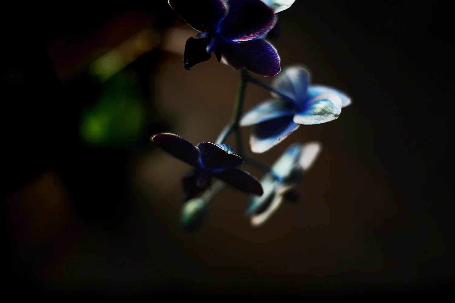 Then today, I had to run into the grocery store, and imagine my amazement when there, right at the entryway, was this incredible blue and purple orchid, just waiting to be purchased. It was called "Black Sapphire." It was more expensive than I usually like to spend on grocery store flowers, but hey -- there was just one left. Surely it was a sign that it was rare! Exotic! Meant to belong to me! So I bought it, took it home, and giddily photographed it in my entryway.