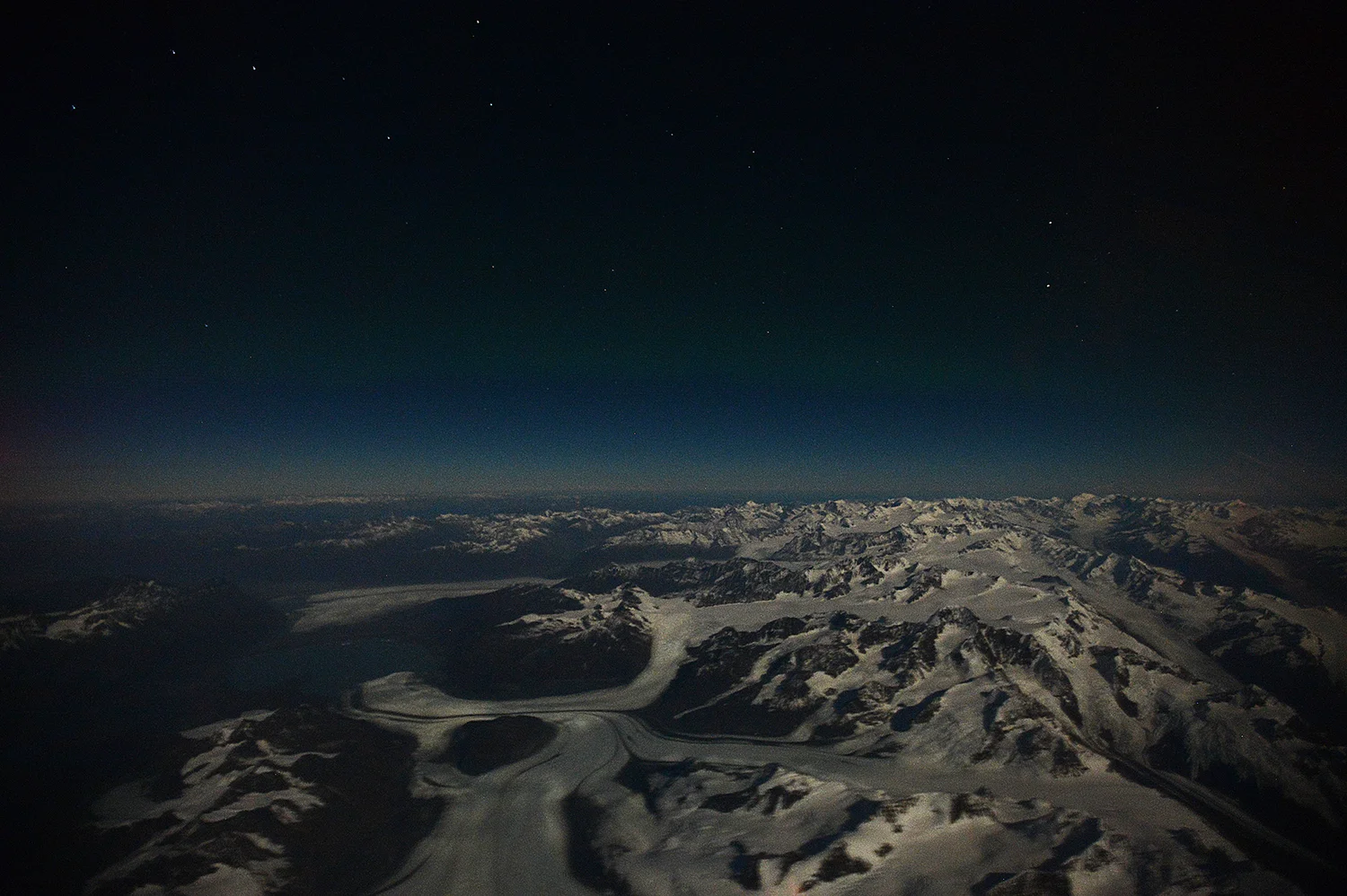 Anyway, my flight out of Anchorage on Friday night was just before midnight. I'd made sure to have a window seat, just in case there was a chance that I might see the aurora as we flew out. As we taxied out to the runway, I thought I saw a blue tinge on the horizon, so I got my camera ready.