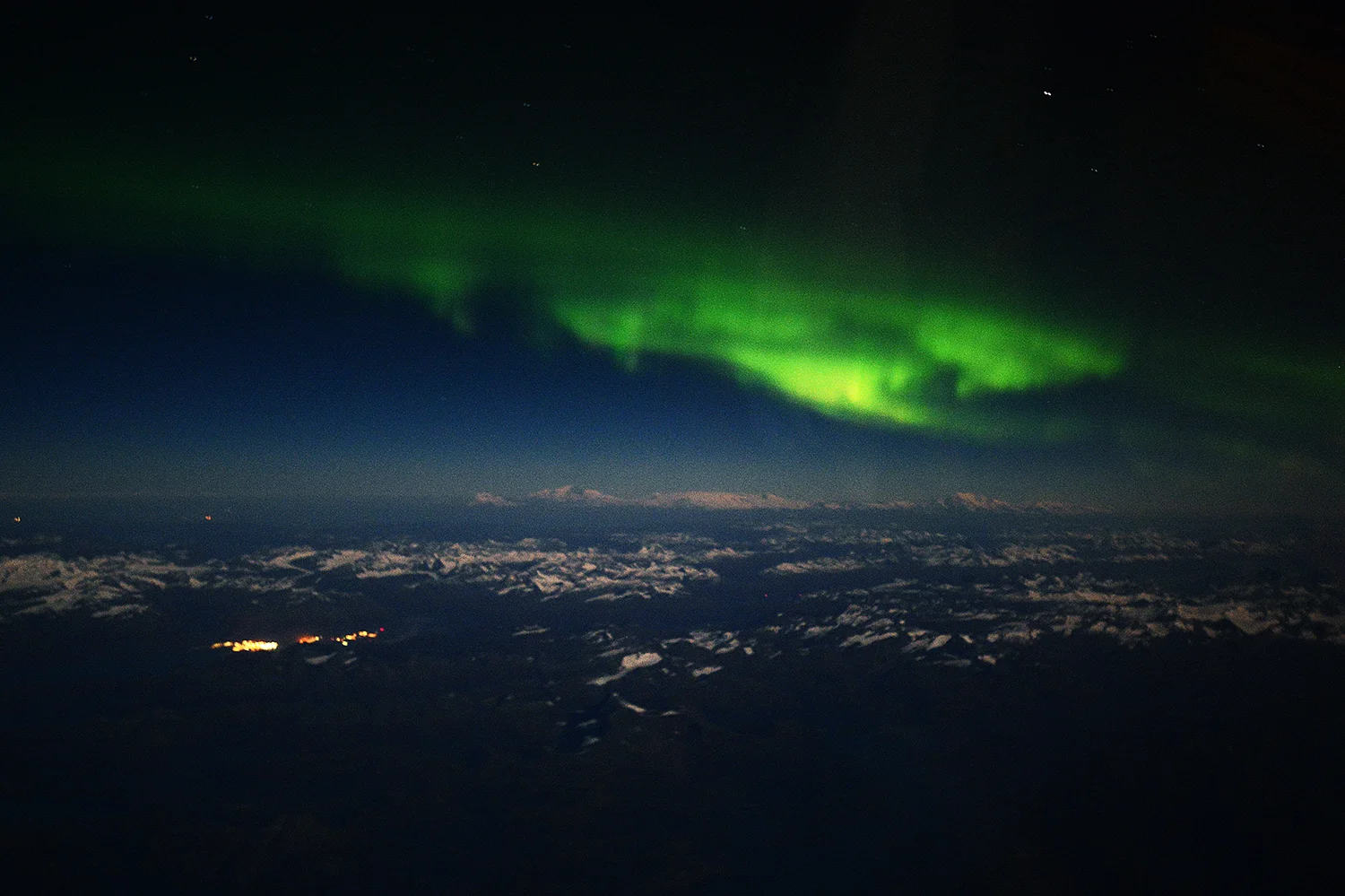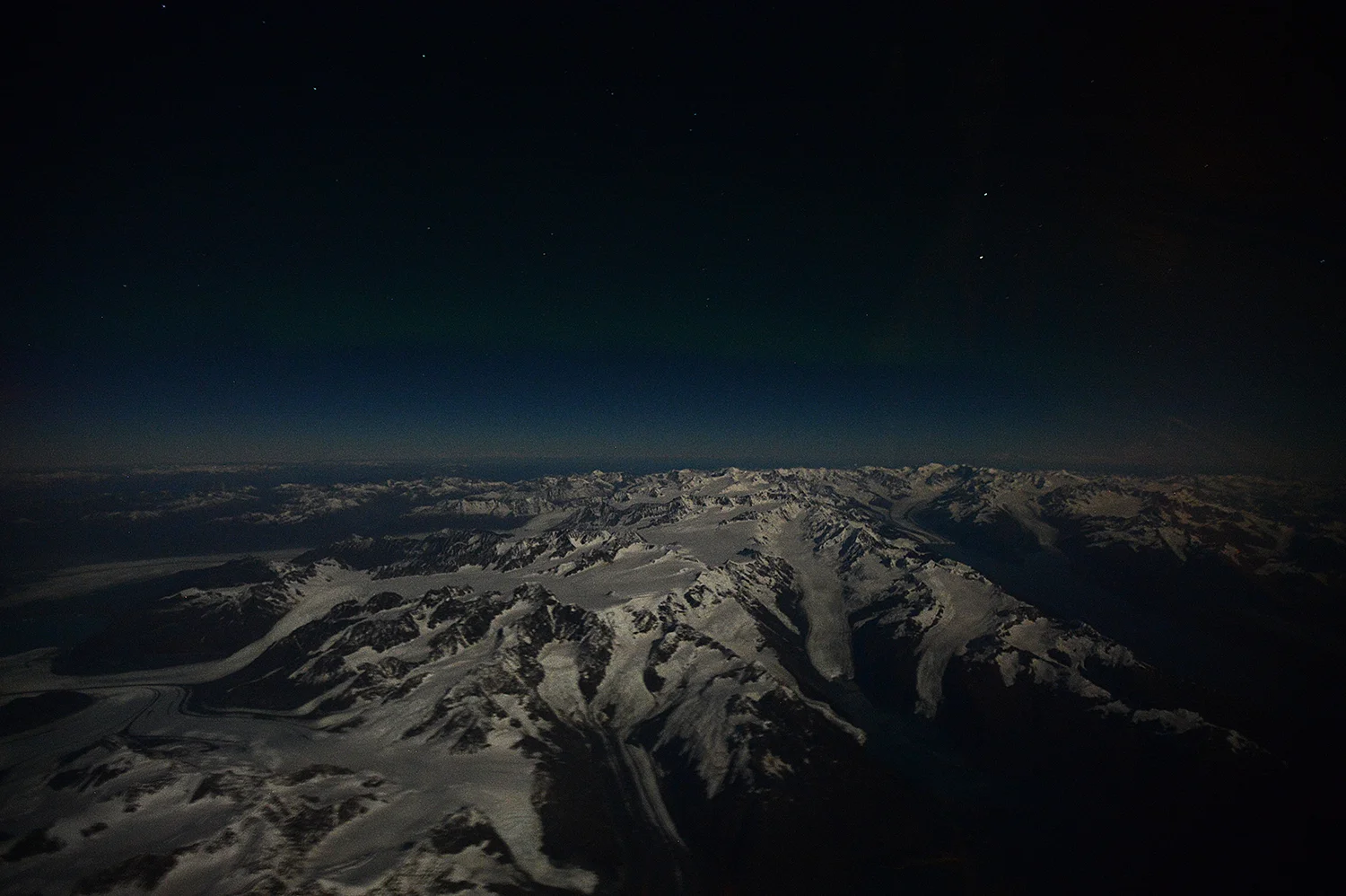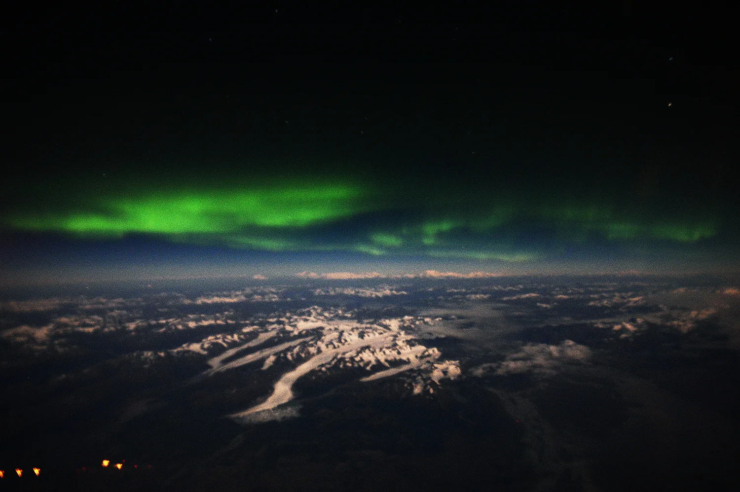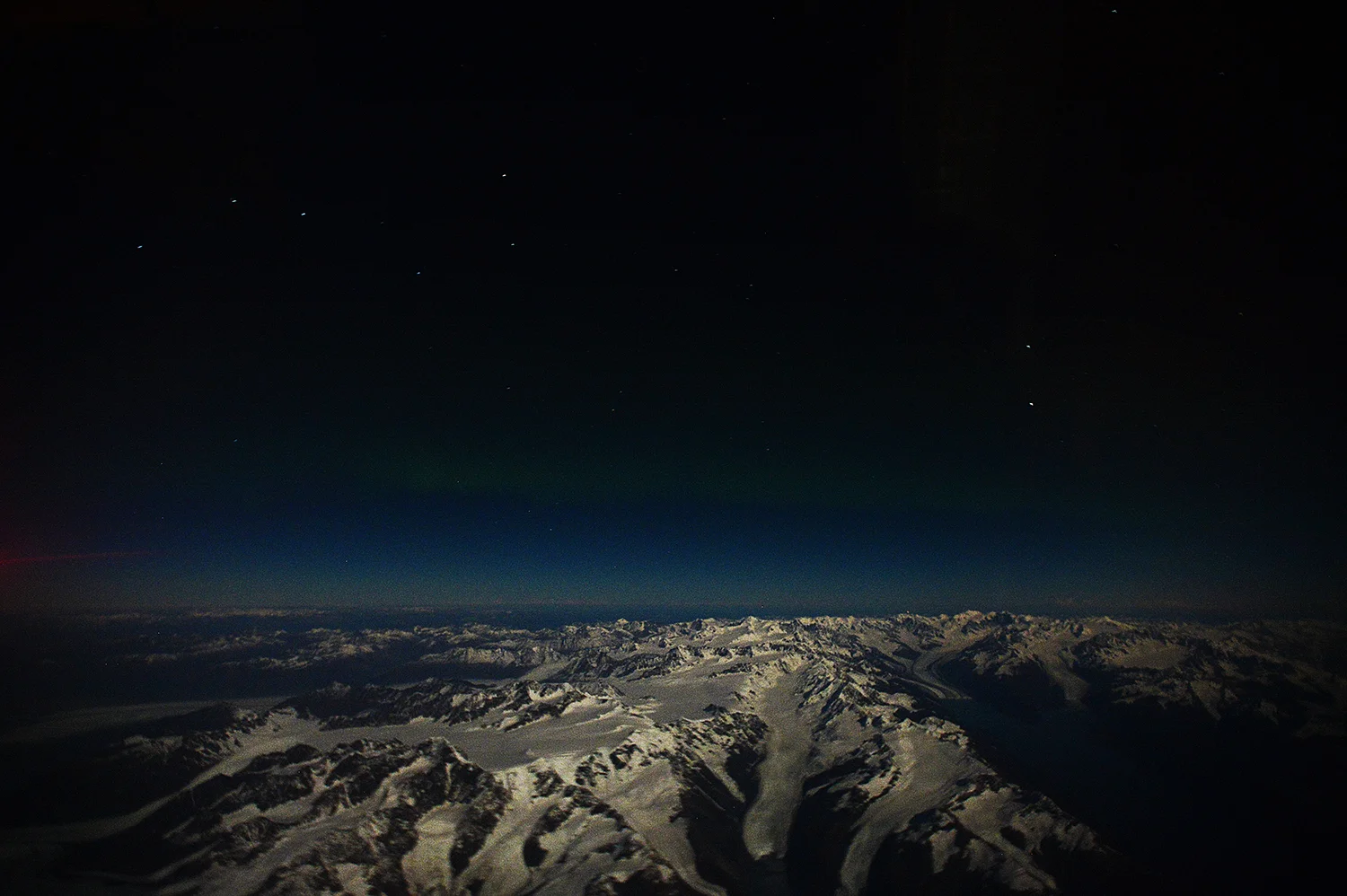 Again, I couldn't actually see these colours with my naked eye -- when I looked outside, it appeared to be just a very faint greyish-blue mist, dancing along the side of the plane for more than an hour. It's only because the shutter was open for as long as it was that the colours were able to appear on the final images (and it's why the mountains look so bright, even though the photos were taken after midnight). If I hadn't actively been looking for them, I absolutely would have missed them altogether.
