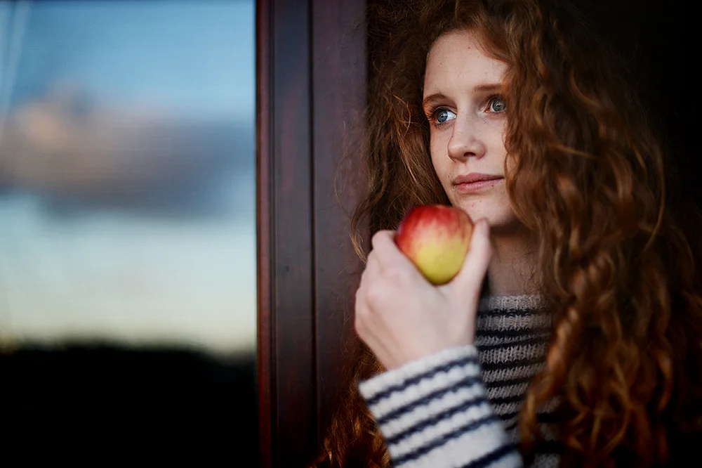 She turned and closed the door. She walked toward the fruit bowl and took an apple. She ate a bite, and looked at the jagged marks caused by her teeth.