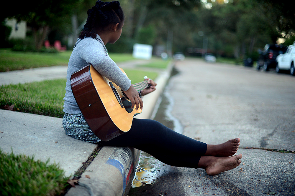 Alex loves to take her guitar outside to practice.