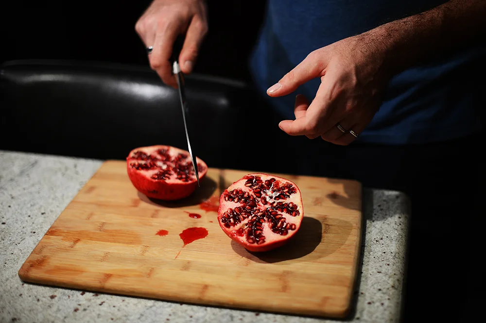 I took this photograph about 2 years ago. Pomegranates always remind me of my father's mom -- she has a tree in her backyard. I remember the first time I had one: I was about Alex's age, and she brought one in from her tree. When she cut it open, I thought it was the weirdest-looking fruit I'd ever seen. And I loved how the seeds popped in my mouth when I bit into them.