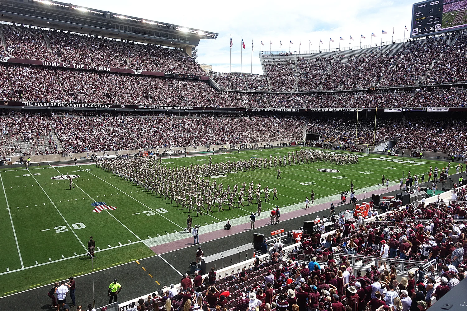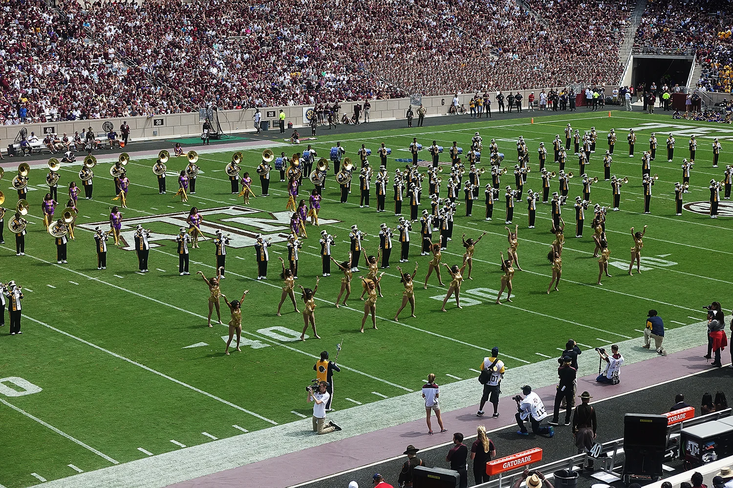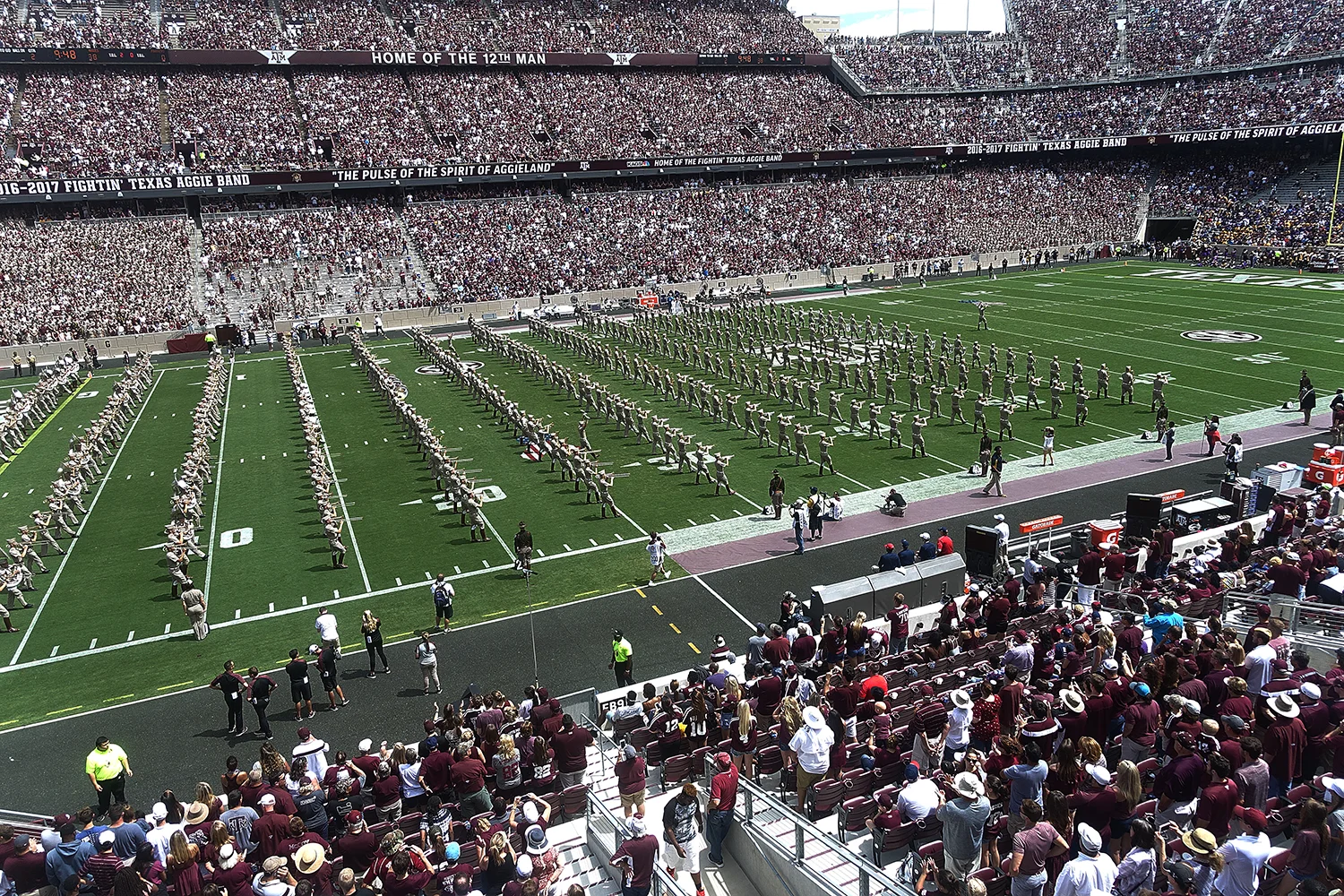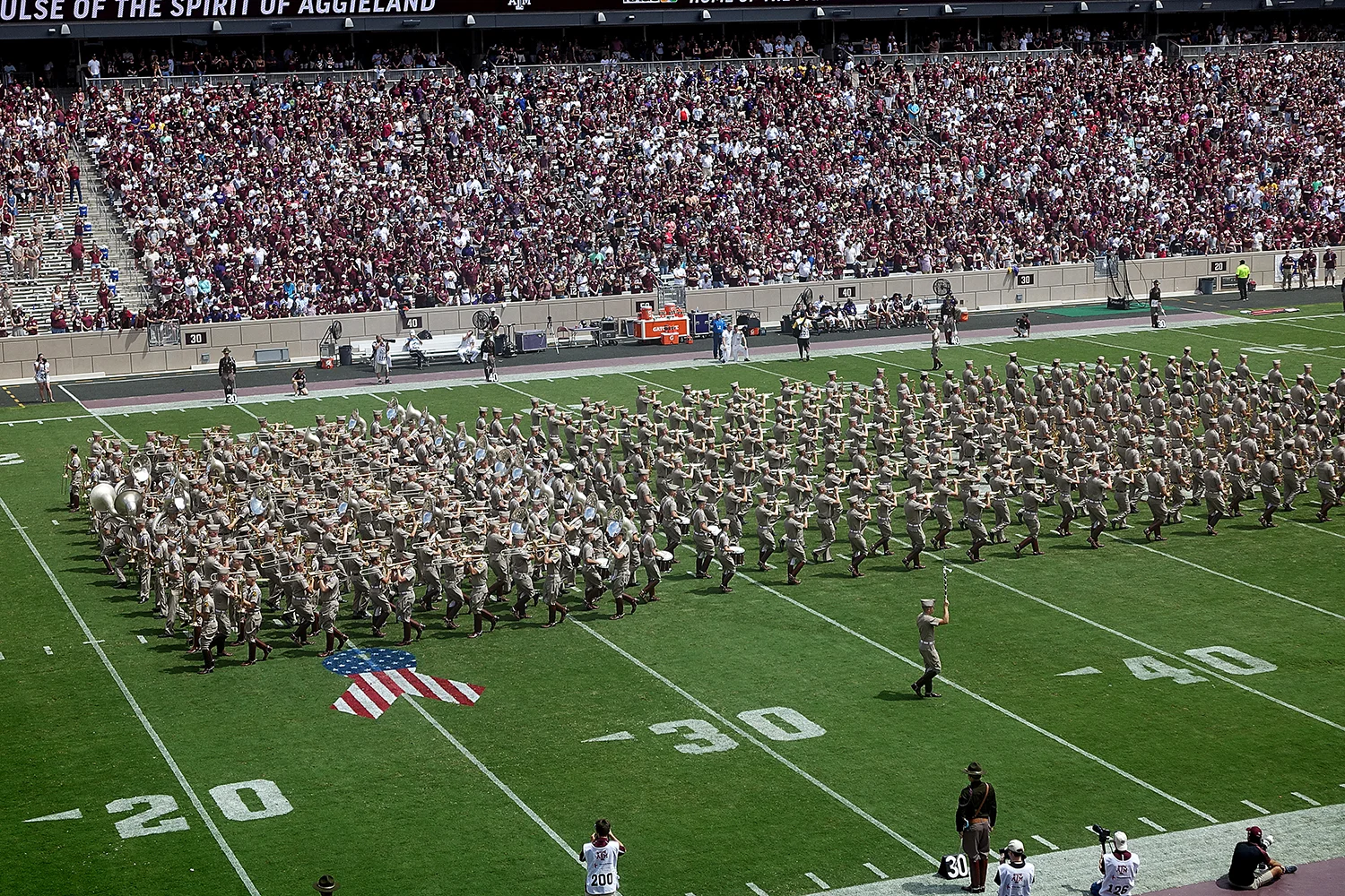 Next up: The Fightin' Texas Aggie Band. So here's a fun fact: Texas A&M University actually began as a military university, and while less than 10% of the current student body is a member of the Corps of Cadets, Texas A&M still manages to commission more officers into the armed forces in the nation every year, except for the United States Military Academies. That said, every member of the band is a member of the corps, and the corp prides itself on its military precision. They're really fun to watch, especially in contrast to the way the Marching Storm broke it all the way down just minutes before.