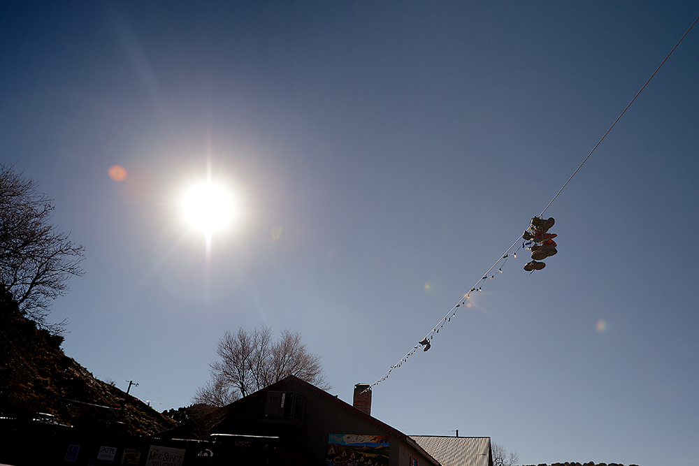 There was something very familiar to me about the scene: it seems no matter what city you're in, wherever in the world you might be, at some point you are likely to come across at least one pair of tennies hanging over a telephone wire. Normally, I assume it's evidence of some kid teasing another kid, but here in New Mexico, it was a cluster of shoes. Surely there wasn't just one bully in this tiny town stealing the other kids' shoes?
