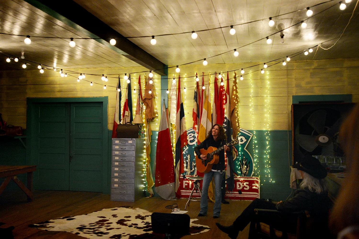 I've mentioned my friend Cheryl before, the owner of Stash, gorgeous leather bags that are all handmade in a beautiful old mattress factory in Sealy Texas. Cheryl is one of the amazing women that will be featured in my book, because if there's one thing she knows, it's how to create a space where everyone around her -- her friends, her employees, her family -- can thrive. And one of the ways she does this is by hosting live music events in the factory: they don't happen very often, but when she has them, they're magical. And this weekend, she hosted a special one to celebrate her 10-year anniversary -- it was a "Stash Family Dinner," with food prepared by James Beard-nominated Houston chef Monica Pope, and a live acoustic performance by the amazing singer-songwriter, Lisa Morales.