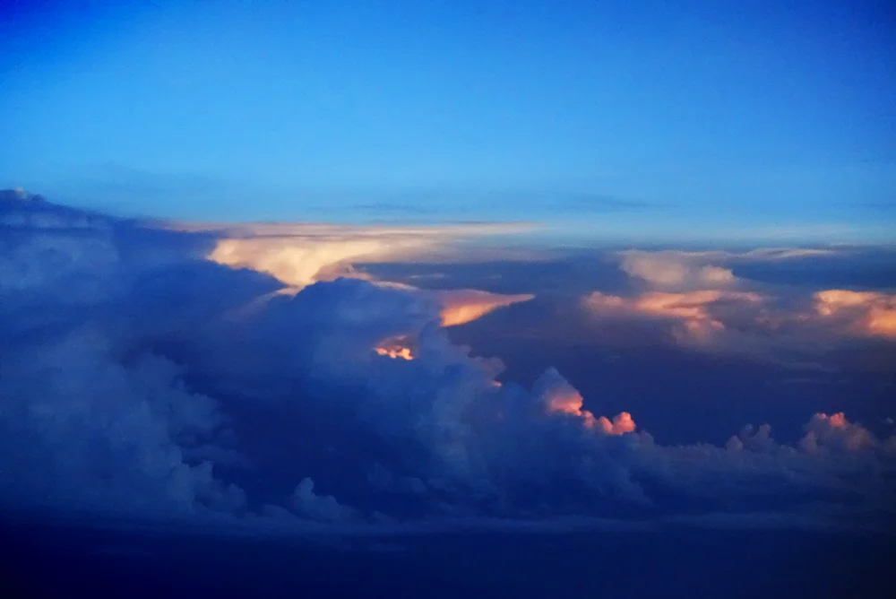 Thunderstorms somewhere between New York and Houston at sunset, August 18, 2015