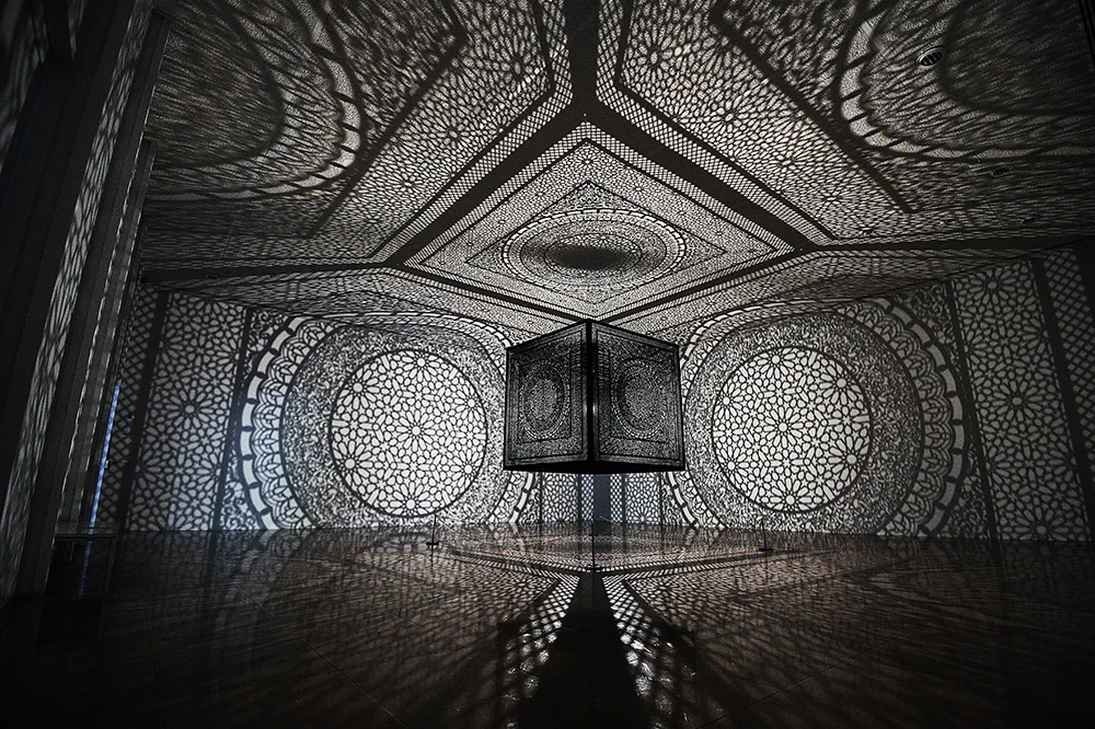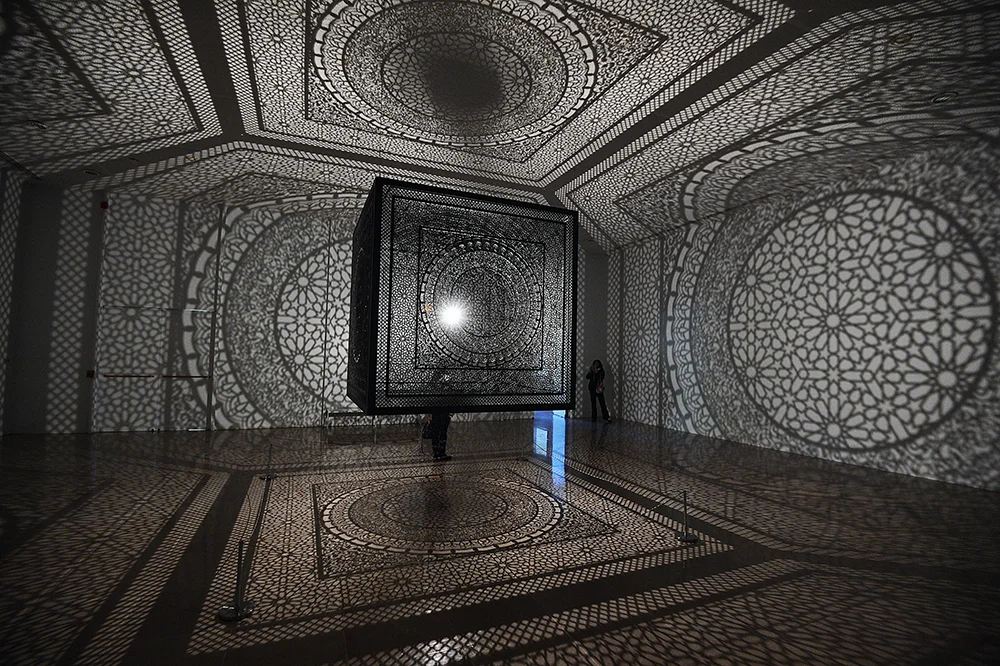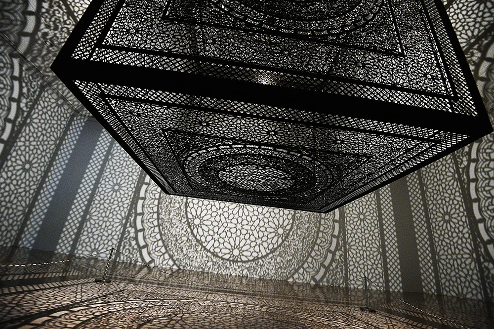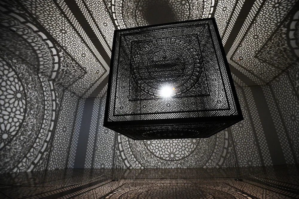 The Rice University Gallery currently has this amazing exhibit, called Intersections. Created by Pakistani-American artist Anila Quayyum Agha, the exhibit is a single, bright light suspended from the ceiling through an intricately laser-cut box made from wood, and painted black. Each side of the cube is the same, inspired by a pattern that Agha saw while visiting the Alhambra, a palace and fortress in Granada, Spain. I saw a video about the exhibit a couple of weeks ago, and I had been thinking about visiting; yesterday seemed like the perfect time to make it happen.